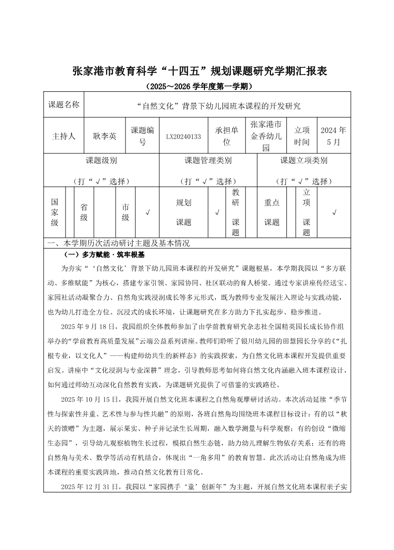 (2025~2026学年度第一学期)“自然文化”背景下幼儿园班本课程的开发研究学期汇报表 来源: 发布时间:2026-01-13 13:32:32 浏览次数: 次 【字体:小 大】 分享到: 【打印正文】