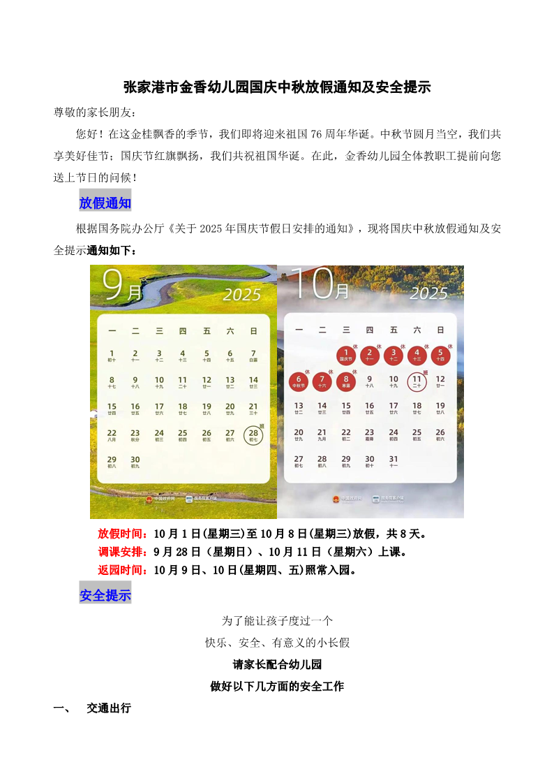 张家港市金香幼儿园国庆中秋放假通知及安全提示