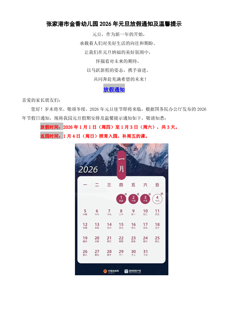 张家港市金香幼儿园2026年元旦放假通知及温馨提示
